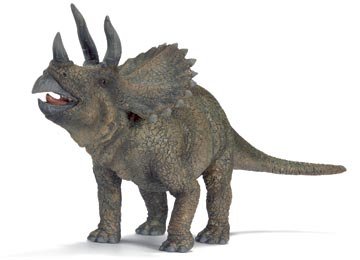 With its three massive horns, few predators would dare attack the Triceratops.Triceratops, although it looked fierce, fed on plants and trees. For this reason, it was hunted by the Tyrannosaurus Rex. The front of its jaw formed a beak, similar to that of a parrot, which it used in cutting vegetation. Triceratops had three horns made of keratin, the same protein that composes fingernails and hair: the horns above its eyes were the longest, extending almost three feet. Since its head was equal to the weight of a small car and approximately one third of its body, its tail was also very heavy to keep its thirty foot long body balanced. Its legs were very strong, similar to an elephant's legs today.